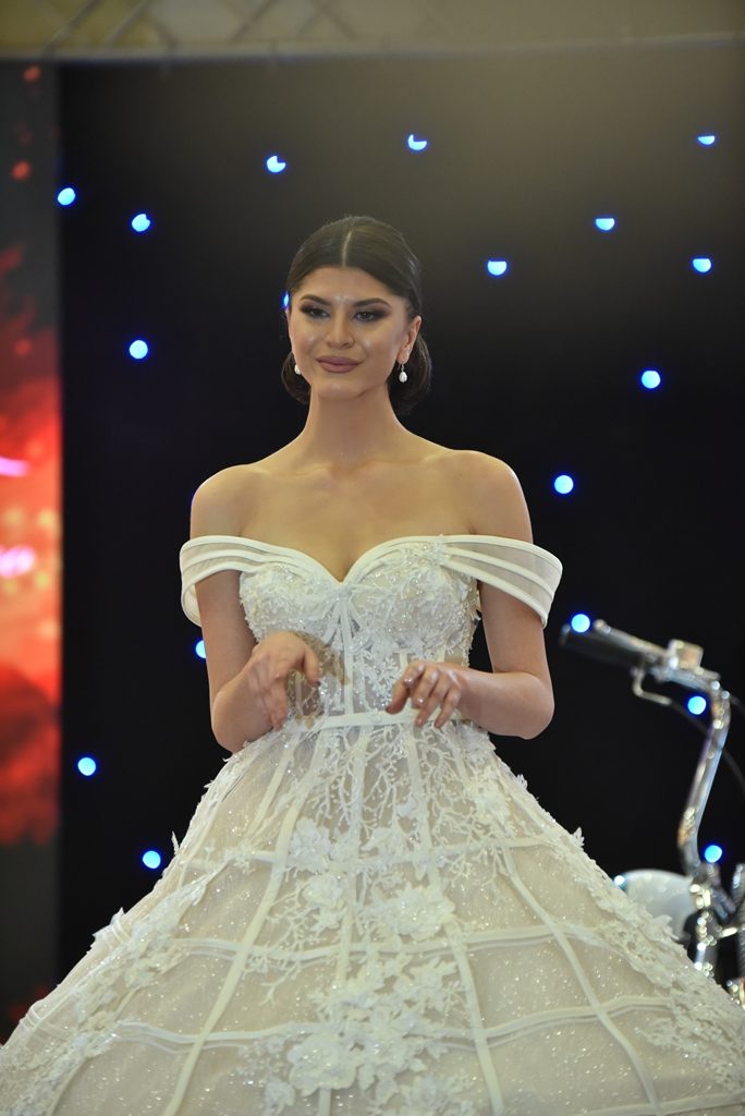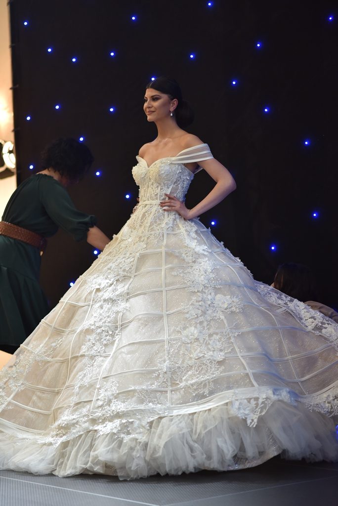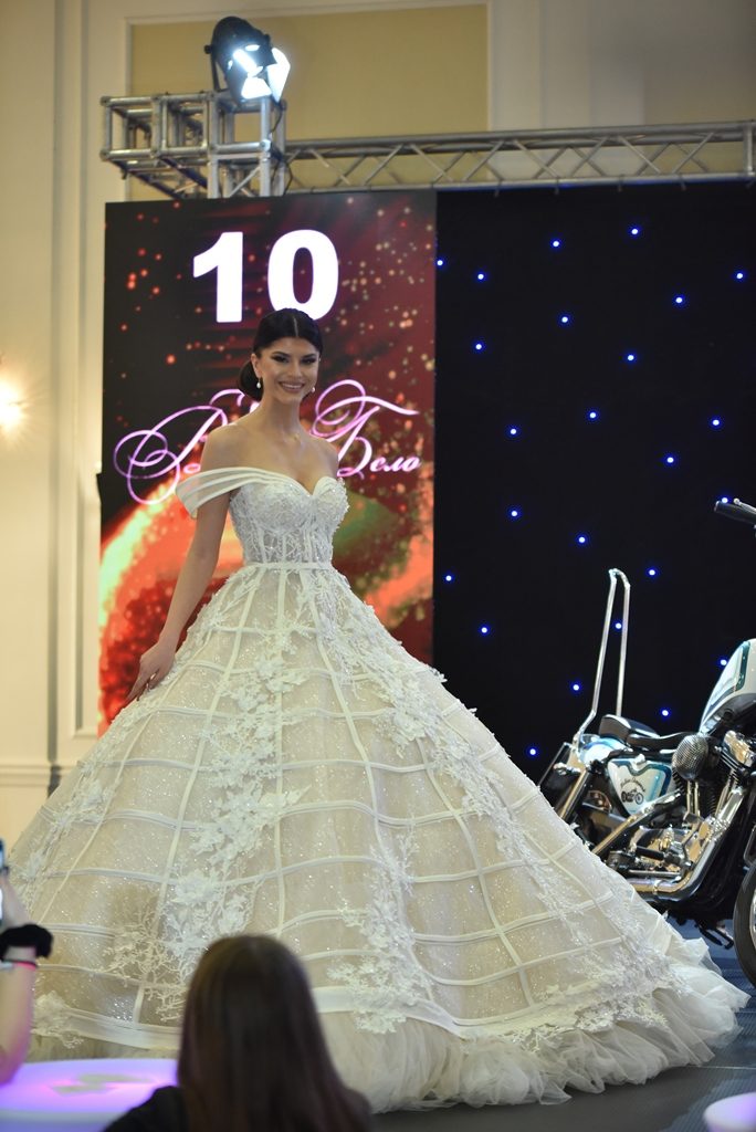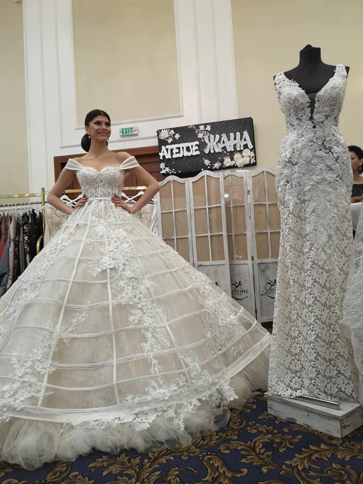 Прекрасната Анѓела Јакимовска на јубилејниот саем за венчавки носеше креација од Атеље Жана. Како вистинска принцеза Анѓела изгледаше совршено, дигнитет и светски изглед беа коментарите на многуте присутни.